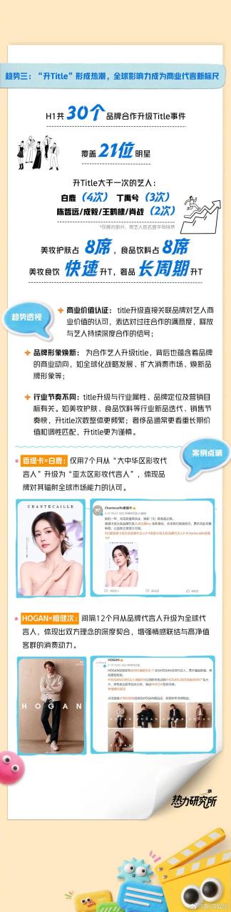 就拿升title这件事来看,今年上半年共有30个品牌合作升级title事件,覆盖21位明星,其中白鹿升了4次,丁禹兮3次,陈哲远、成毅、王鹤棣、肖战各2次。如白鹿代言香缇卡,一开始叫做“大中华区彩妆代言人”,7个月后升级成为“亚太区彩妆代言人”。