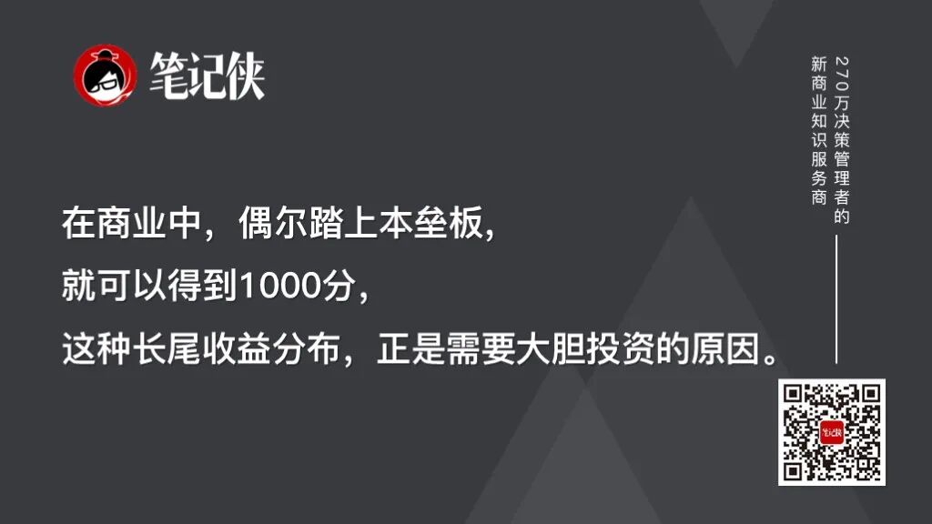 他说:“你仍然十有八九可能会是错的。在商业中,当你偶尔踏上本垒板,你就可以得到1000分,这种长尾收益分布,正是需要大胆投资的原因。大赢家会为之前的许多次尝试买单。”