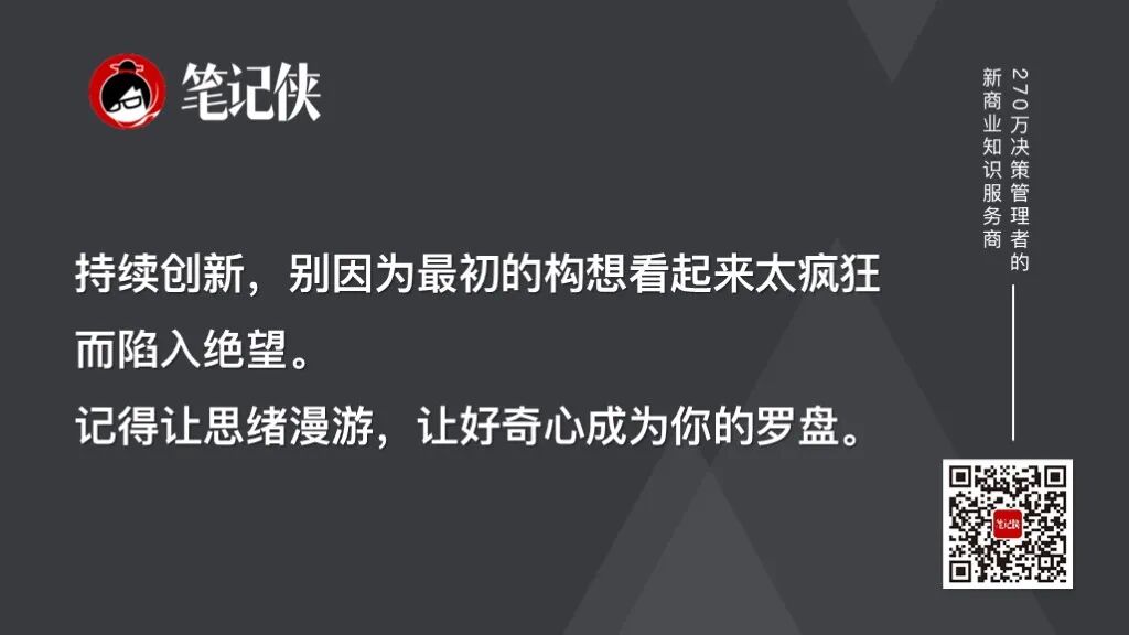 持续创新,别因为最初的构想看起来太疯狂而陷入绝望。记得让思绪漫游。让好奇心成为你的罗盘。记住,今天依然是“第一天”。