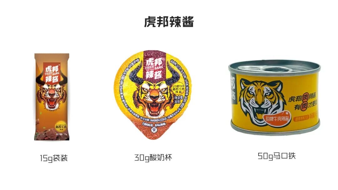 所以为匹配这一场景,在产品设计了,虎邦放弃了200-300克玻璃瓶装这一主流形态,而是开发了15g袋装、30g酸奶杯装、50g马口铁装等小包装产品,刚好是一顿饭的量;包装材质避开易碎的玻璃,也更适合外卖配送。