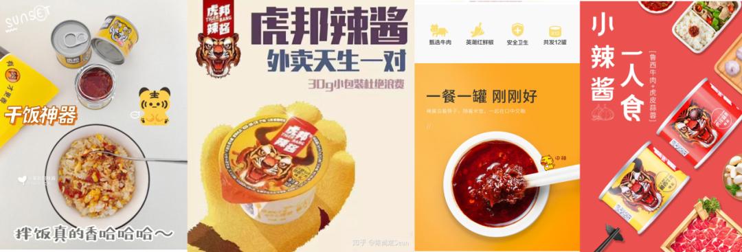 城市白领+大学生是外卖消费的主力军,而他们因为在家做饭少,去超市采购食材少,又是传统辣酱品牌的边缘人群,同时还是辣酱消费升级的核心人群。虎邦在外卖场景下创造了不同传统辣酱的新体验、新形象,由此找到了自己的独特细分市场和差异化品牌价值。