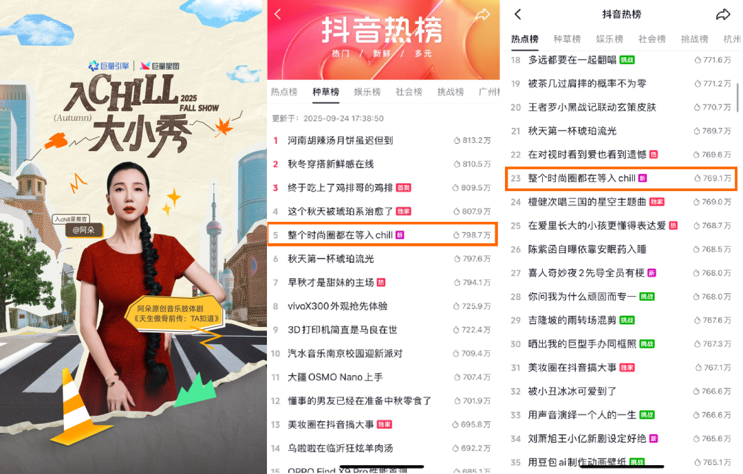 这样的组合拳之下, #整个时尚圈都在等入chill ,霸榜种草榜top 5,热点总榜top 23,持续在榜超过3天.