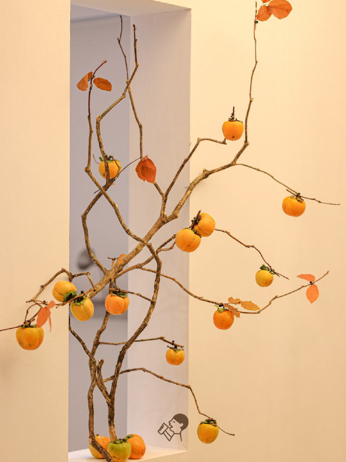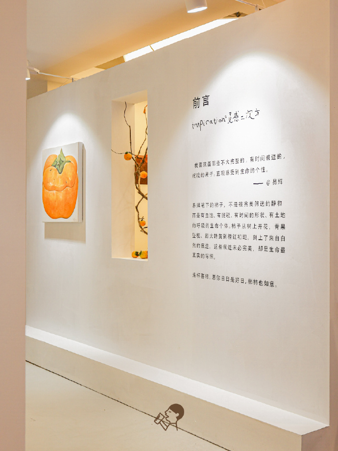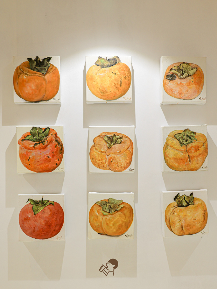 展览的核心是“柿子的一生”,易辉用画笔记录了柿子从青涩、成熟到腐烂的完整变化历程,而且他的创作理念也非常纯粹——想要还原那种喝着喜柿多多,在秋日公园里发呆的平静与温柔。