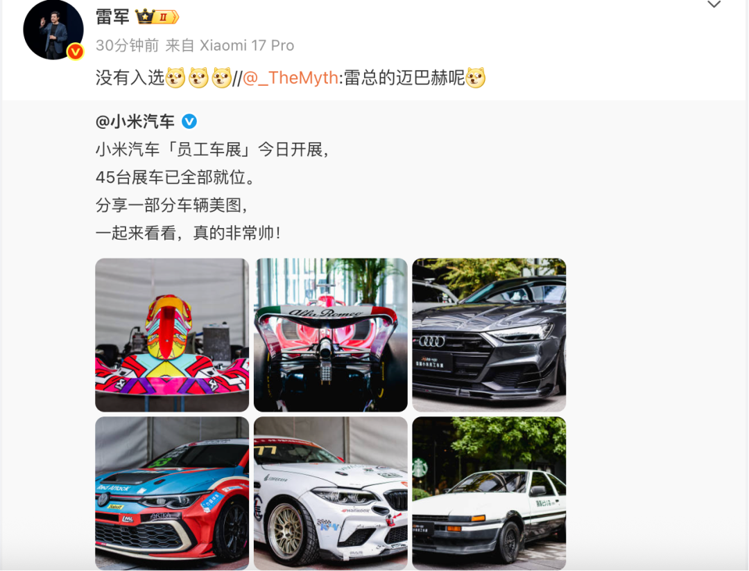 有网友疑问为何没有雷总的迈巴赫时,雷军大方回应“没有入选”。