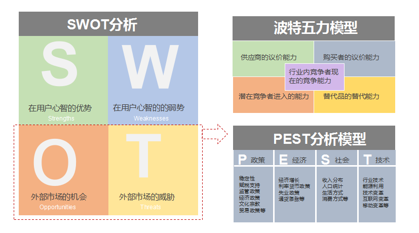 都是在进行企业分析频繁用的的分析工具,分别是SWOT分析模型、PEST分析模型、波特五力模型,这三个模型不是每一个都要做完整的分析,主要是以SWOT为主,另外两个对其进行补充。在使用的过程中,针对SWOT中的 O(外部机会)和T(外部威胁)时候,可以分别通过PEST及波特五力模型进行针对性分析,分析结束后再回到SWOT表格进行其他方面内容分析。