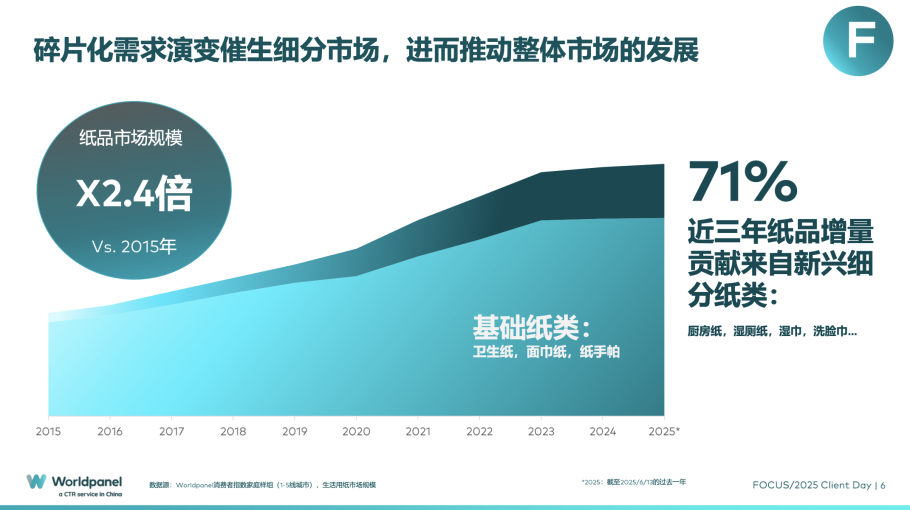 细分需求不仅可以从消费动机角度切入,还可以从不同的生活方式和生活场景切入。比如纸品市场近三年的增量就主要来源于新兴细分品类,包括厨房纸、湿厕纸、湿巾、洗脸巾、消毒湿巾等。