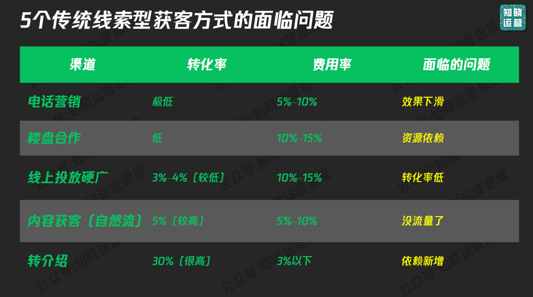 以家装行业为例,过去主要依赖五种获客方式,但现在每一条路都越走越难: