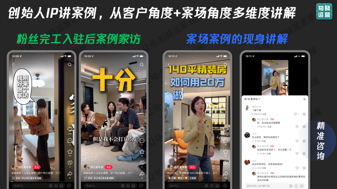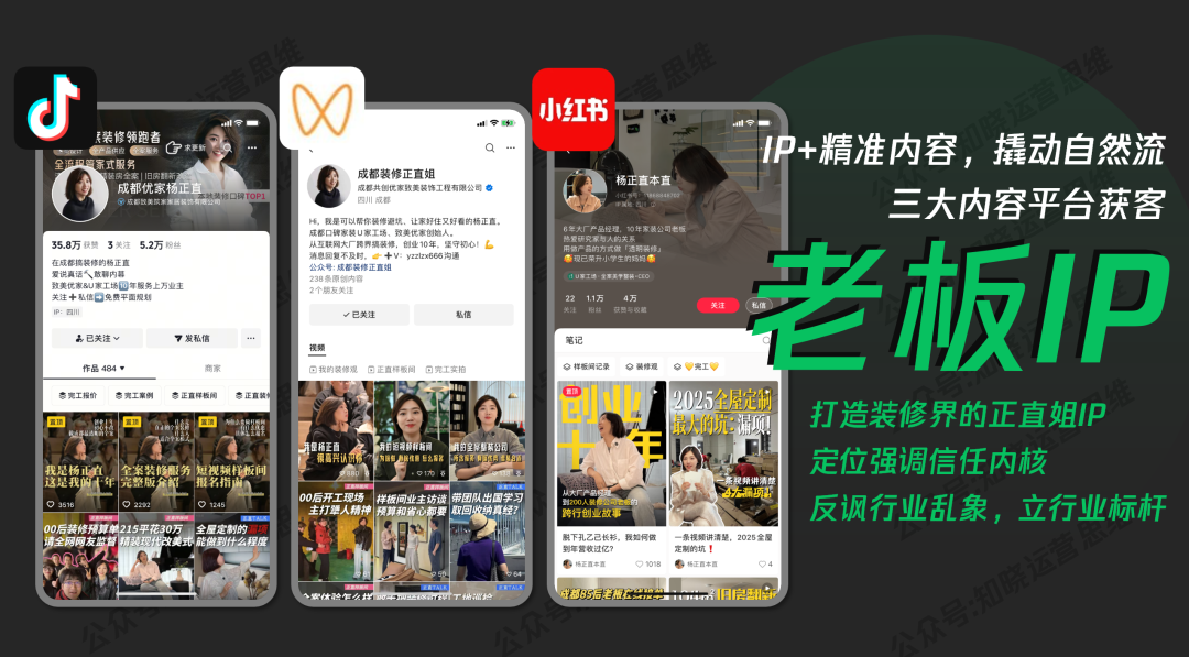 优家工场的第一步,就是让老板站出来做IP,在抖音、小红书、视频号的获客平台上,打造了“成都装修杨正直”的个人IP。