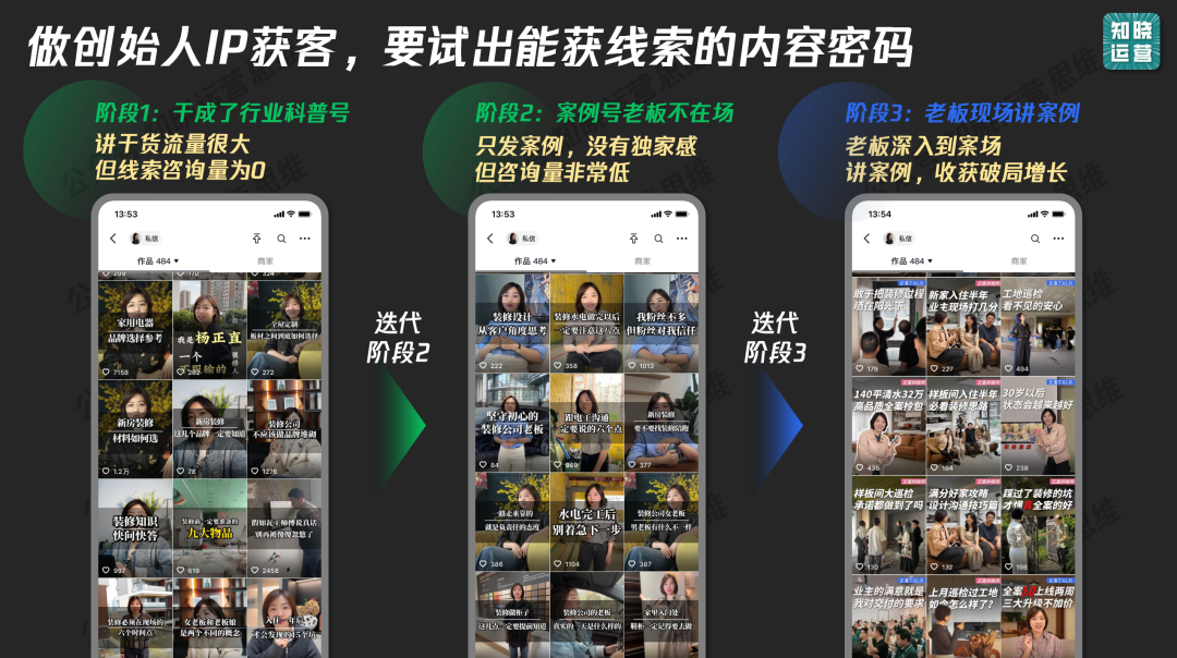 团队一开始学网上的爆款方法论,拍了几十个热门话题。流量确实有,比如百万级曝光,但咨询量是零。最后想明白了,老板做IP是为了服务客户、做生意,而不是当网红拿曝光量。