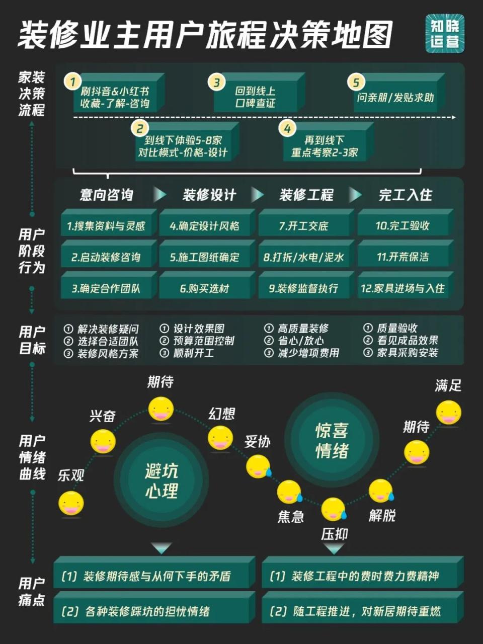 我梳理了一张业主装修决策旅程的用户地图,细化到决策阶段,一般装修业主决策可能持续好几个月,会经过有六个步骤: