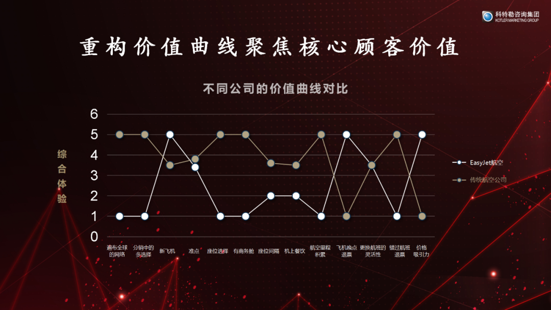 大家看这张价值曲线,两条线代表两家航空公司,但这两家航空公司的服务体验完全不一样,根本原因在于他们选择了不同的核心顾客。一家是低成本航空,一家是传统航空。这对设计同学的启示是:设计时,心中必须有人,那些你认为最重要的人。