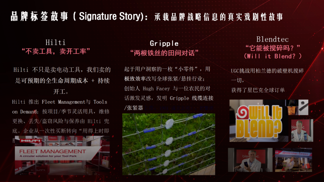 再如吉列剃须刀,其标签故事是“Kiss and Tell”:鼓励男性每日剃须,以便更亲密地亲吻爱人、孩子,诉说爱意。这是他的一个倡导,也是一个故事,这就成为很多人每天坚持刮胡子的重要内心来源。每个伟大品牌都有这样真实、戏剧性且情感内核鲜明的标签故事。