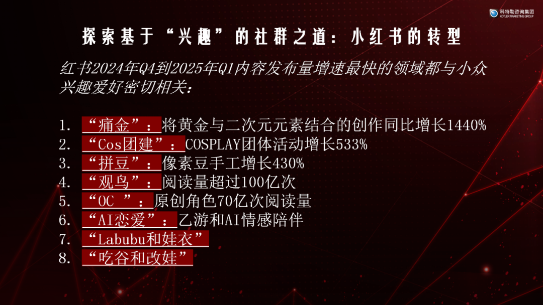 众所周知,小红书正从生活指南转向了基于兴趣的超级社群,背后是平台商业逻辑与数据维度的丰富。一组数据反映了当下中产与年轻人的生活现实:2024年第四季度至2025年第一季度,全平台内容增长最快的领域均与兴趣爱好相关。