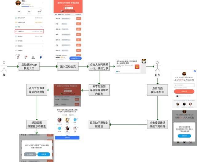 用户 — 启动app — 进入互动页 — 落地页 — 分享用户成功 — 好友 — 注册 — 接受 — 领取红包。