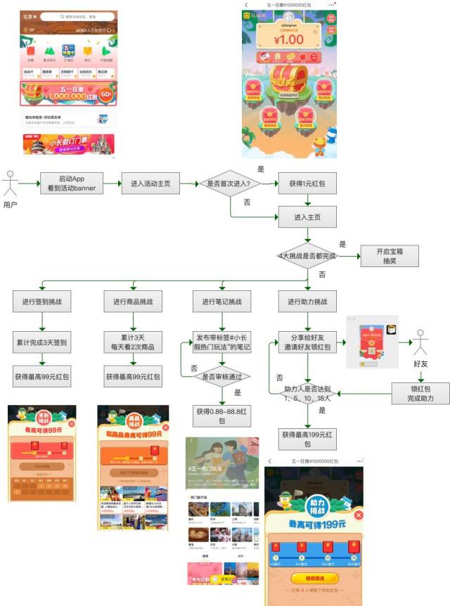 用户 — 打开app — 今日活动页 — 是否进入 — 获取一元红包 — 进入活动挑战 — 挑战成功 — 开启宝箱。