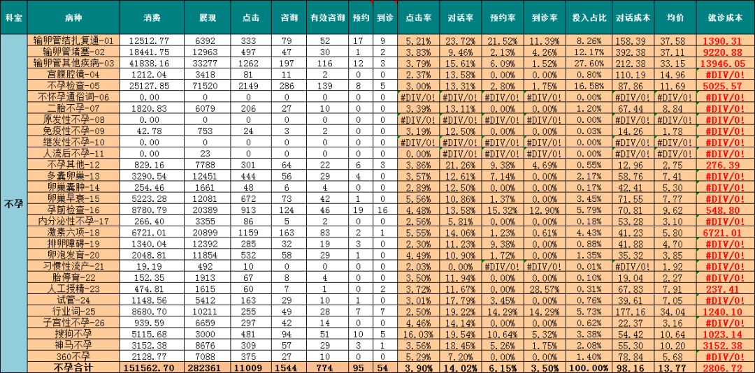 病种的优化,一般从病种表去分析,主要分析维度包括,点击率、均价、对话率、到诊率、投入占比、对话成本、到诊成本。