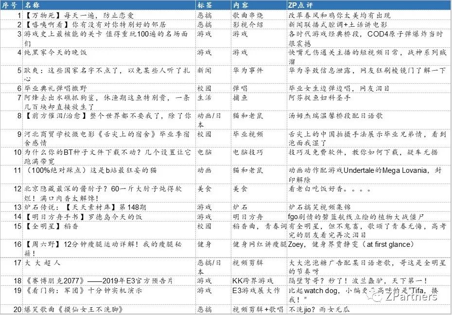 (6月11日当晚热门前20视频/标签/ZP点评)