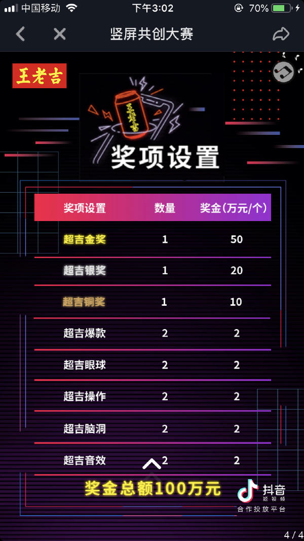 最后再来说一说抖音官方为大家准备的“大礼包”——挑战赛。抖音官方会不定期公开一些挑战活动,创作者可以报名参与。比如#吉是所有美好的开始#挑战赛,就是王老吉在抖音开启的话题定制竖屏大赛。