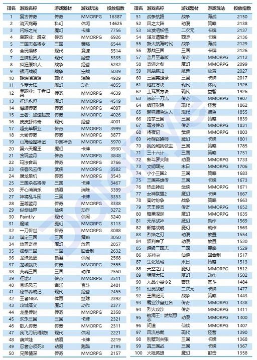白皮书按投放指数,整理出了排名TOP100的游戏产品。排名第1的是名为《复古传奇》的MMORPG游戏,投放指数高达16387;第2名是休闲游戏《消灭病毒》,投放指数为14625;第3名是卡牌游戏《闪烁之光》,投放指数为7756。