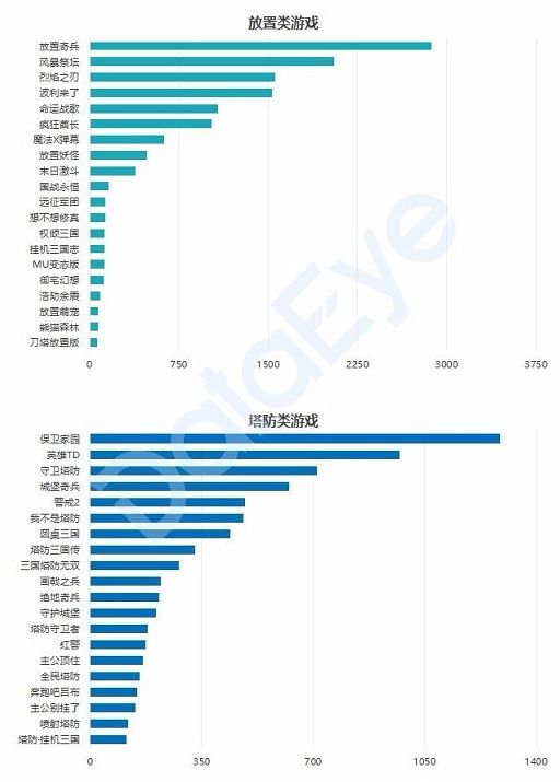 《放置奇兵》排名放置类游戏投放指数第1,不足3000。塔防类游戏第1是《保卫家园》,投放指数近1400。