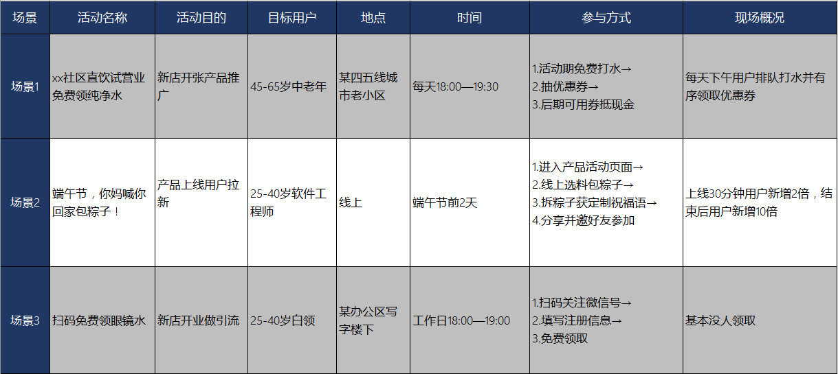 - 场景1:免费领纯净水→现场火爆→活动成功;