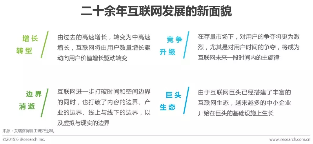 在经历二十多年的高速增长之后,互联网展现出新特点,包括:1)增长转型;2)竞争升级;3)边界消逝;4)巨头生态。