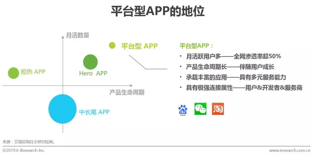 平台型APP具有月活跃用户规模大,产品的生命周期长,以及极强的连接属性,这意味着,平台型APP能够获取足够多的流量,并通过自身核心服务将流量存留,同时将流量分发给合适的开发者,以此来实现巨头生态内部的闭环。