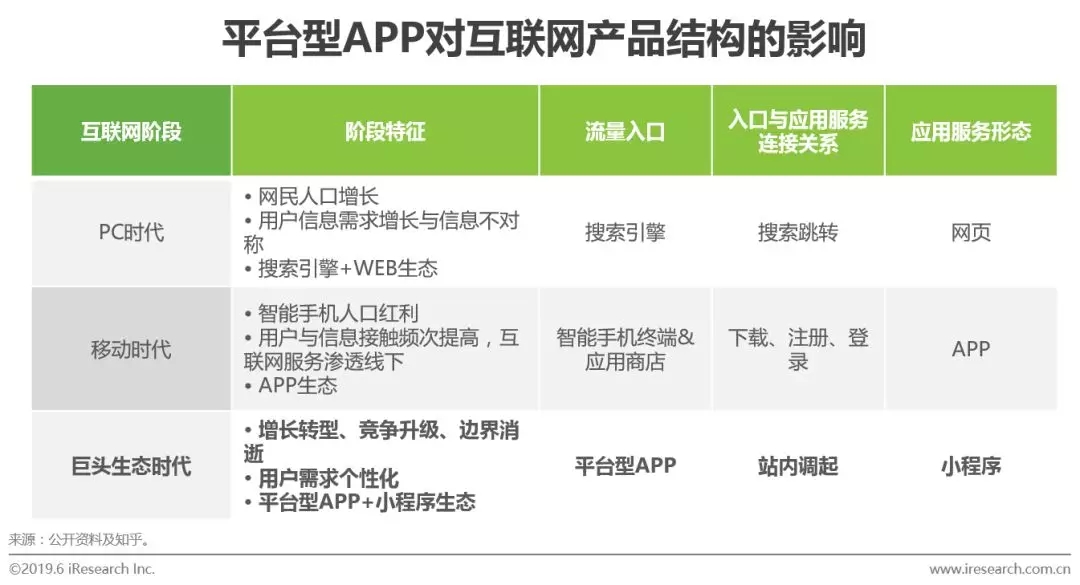 整体来看,中国的互联网经历了三个明显的时代,分别是PC时代、移动时代和巨头生态时代,在这三个时代下,其发展特征,流量入口、应用服务形态,以及流量入口与应用服务形态的连接关系各不相同,未来,互联网将逐步发展为以平台型APP+小程序为典型的产品结构,互联网产品的边界进一步被打破,平台型APP将成为包罗万象的生态系统。