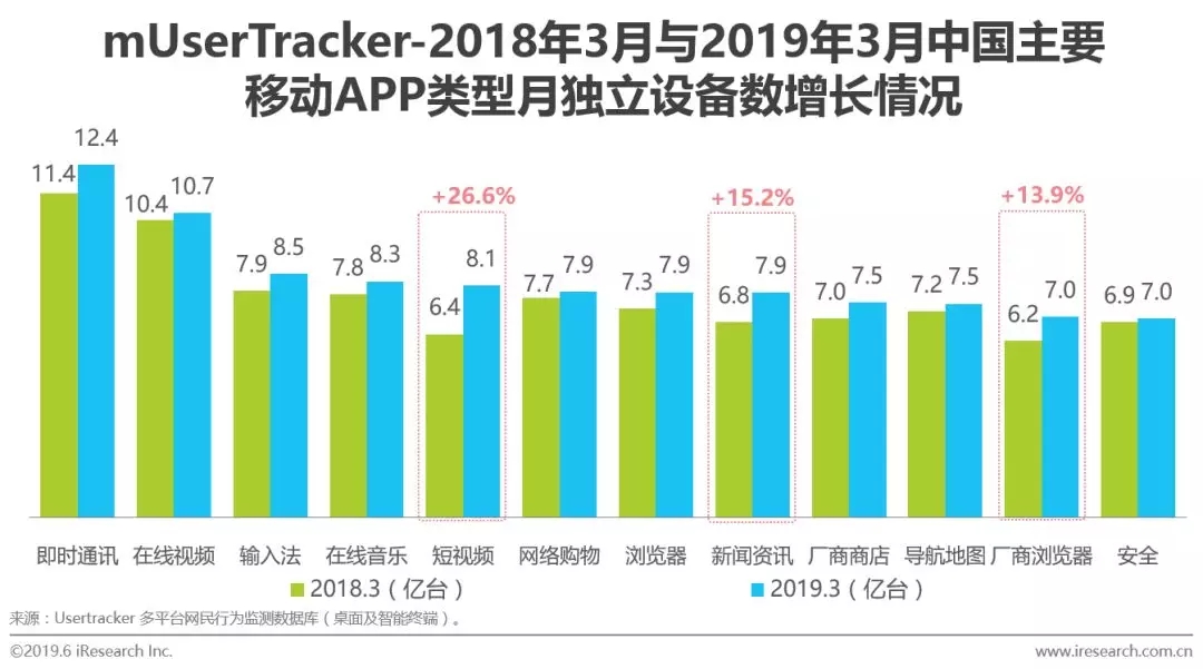 以2018年3月和2019年3月数据对比为例,在这一年中,短视频类APP、新闻资讯类APP月独立设备数同比增长在所有APP中表现突出,分别增长了26.6%和15.2% 。