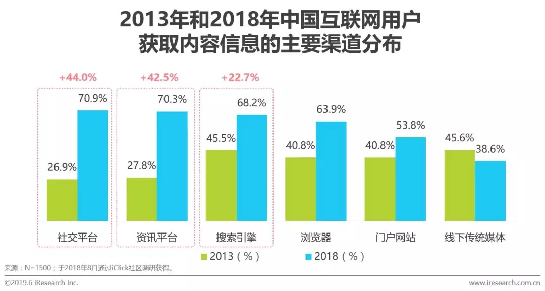 与五年前相比,用户获取内容的渠道发生明显变化: