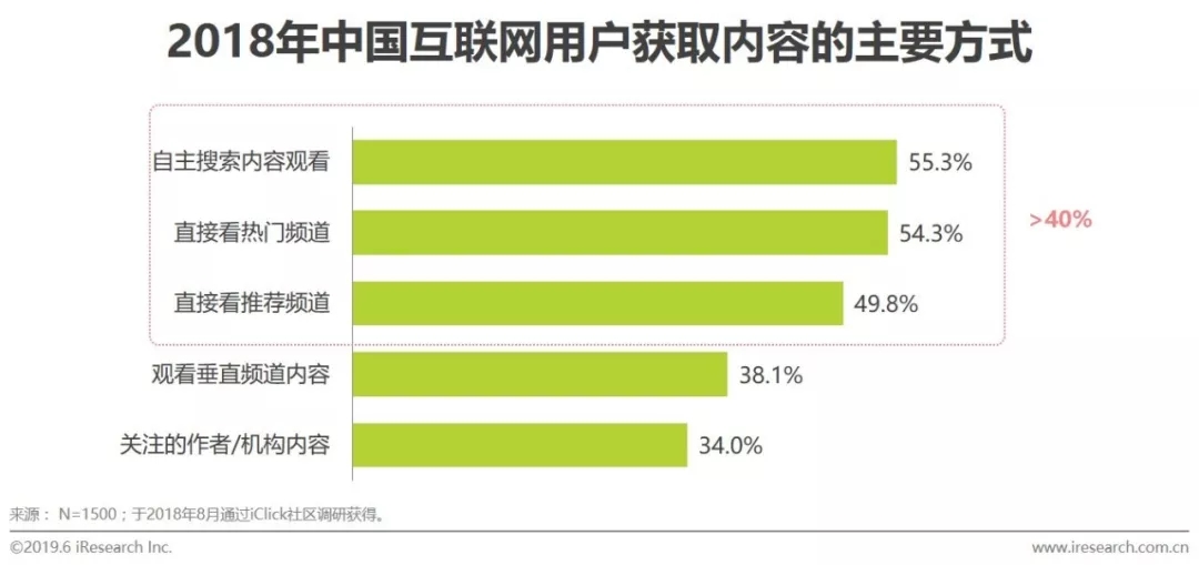 与过去用户依赖于编辑选定的信息推荐不同,今天用户选择内容更为自由,调研数据显示,用户今天获取内容的主要方式包括自主搜索内容观看,直接看热门频道,直接看推荐频道,三者占比分别为55.3%、54.3%和49.8%。与此同时,用户也会直接进入垂直频道,而对内容生产者的关注也在这一过程中起到作用。
