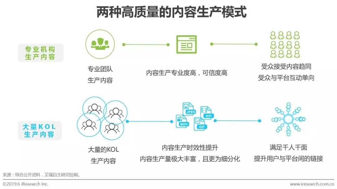 在信息爆炸的客观环境和用户高品质信息需求增长的主观条件影响下,高效地内容生产是满足内容消费的前提,而在这其中,高质量的用户和内容生产者成为各方争夺的核心,尤其是高质量的内容生产模式成为平台竞争力的关键所在,艾瑞分析认为,兼具专业机构生产内容和大量KOL生产内容两种模式的平台将在竞争中更有优势。