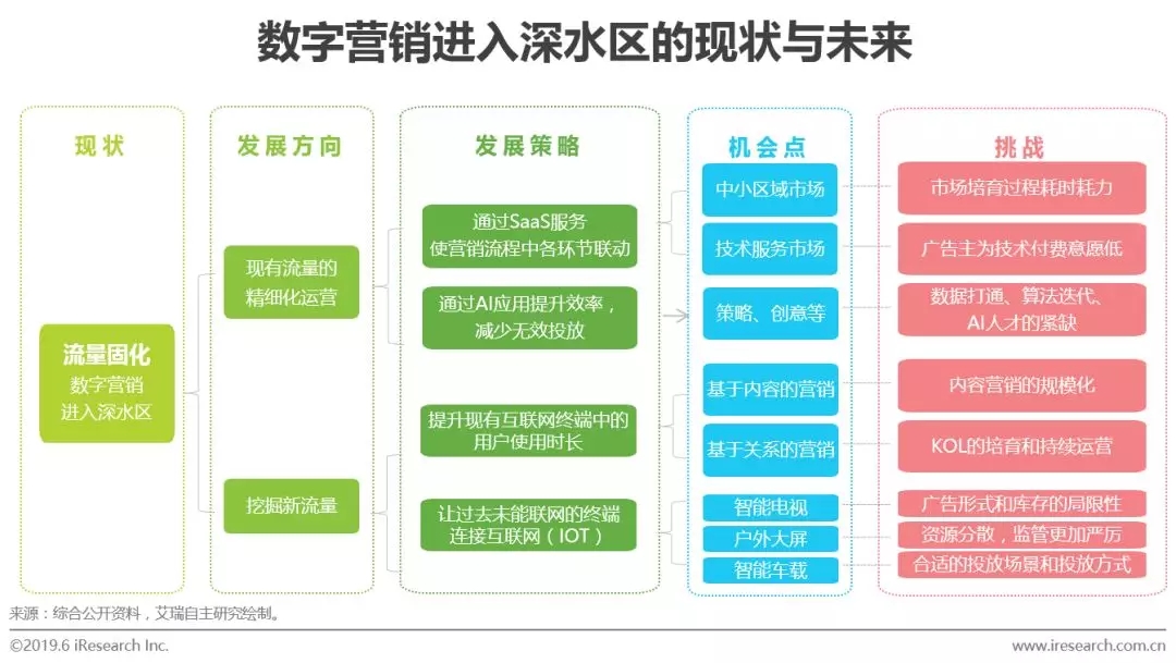 从1997年第一个互联网广告算起,中国数字营销已经走过二十个年头,二十年间,其获得了超高速增长,2018年市场规模接近5000亿,但随着互联网环境的变化,作为广告基石的流量,其固化现象越发明显,数字营销进入深水区,尤其体现在两个方面: