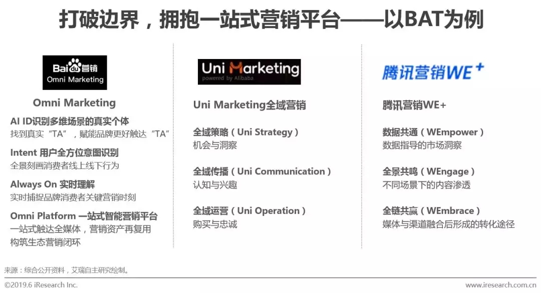 面对营销环境的变化,以及广告主需求的升级,国内头部媒体均提出了自己的解决方案,例如百度的Omni Marketing,阿里巴巴的Uni Marketing,腾讯的营销WE+等,这些方案的总体思路不谋而合、异曲同工,其核心均在于整合,整合数据资源、整合媒体资源、整体投放能力,同时在底层依靠统一的数据管理、AI应用等实现去边界化的营销活动。