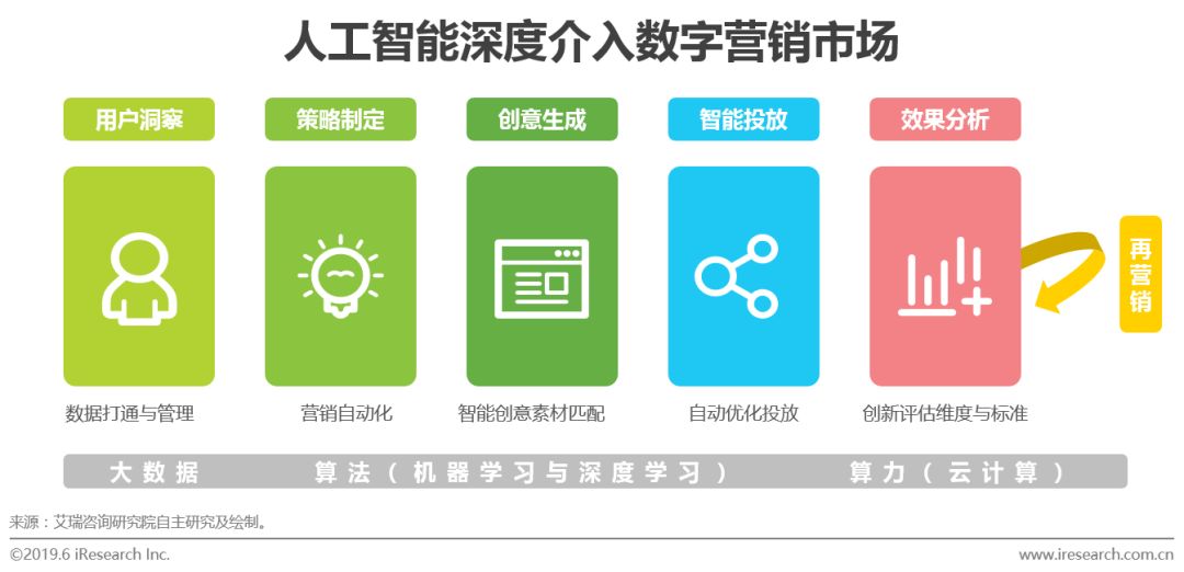 人工智能在数字营销中的应用,将对数字营销产生巨大的价值,人工智能将逐步深度介入数字营销中的各个环节,从用户洞察、策略制定,到创意生成、智能投放、效果分析以及再营销等,从而让数字营销更加智能高效。