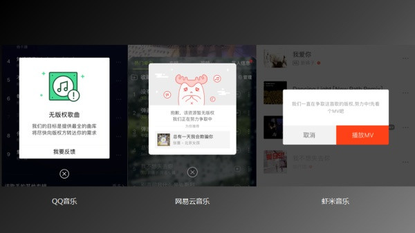 这里先举个QQ音乐、网易云音乐和虾米音乐在无音乐版权情况下的反馈: