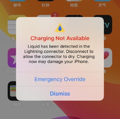 iPhone充电,如果充电口存在液体,会出现安全提示。