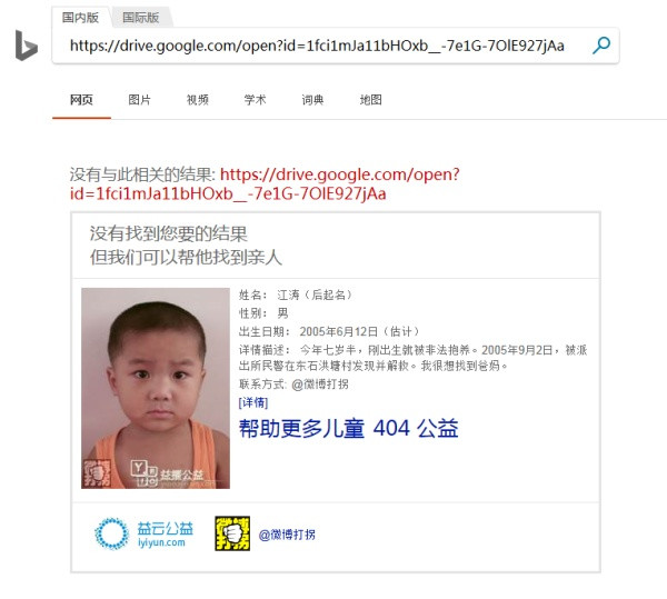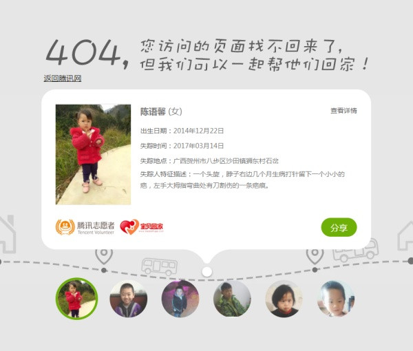 Bing搜索和腾讯网404 no found界面用来做走失儿童公益。为了能让大家看得更清晰一些,这两张图我就不缩小了,希望宝贝能尽快回家。