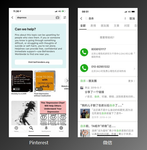下图分别来自Pinterest和微信,Pin在搜索输入depress、suicide等极度负面情绪词汇的时候,会出现“Can we help”提示,告诉用户这些图片会让人情绪低落,如果你或别人正在经受困难,甚至想自杀或者伤害自己,我们可以帮助你,你并不是孤单一个人。
