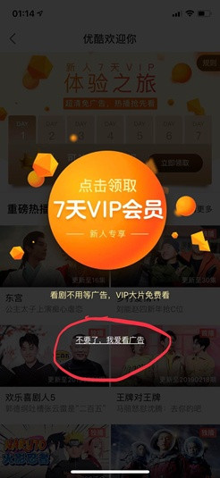 比如下面优酷赠送会员的浮窗,理性看用户领取会员是最佳选择,优酷也想从文案上让原本二选一的选择题变成唯一答案的必选题。但这一句“不要了,我爱看广告”让我感觉受到了羞辱和嘲笑。我选择都不选,退出并清理后台。