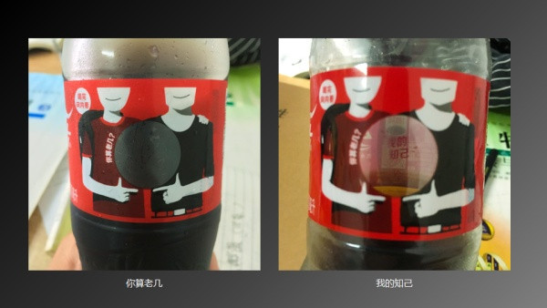 可口可乐的营销案例:字可能看不清,左图写着“你算老几”,当喝完可乐就会看见答案“我的知己”