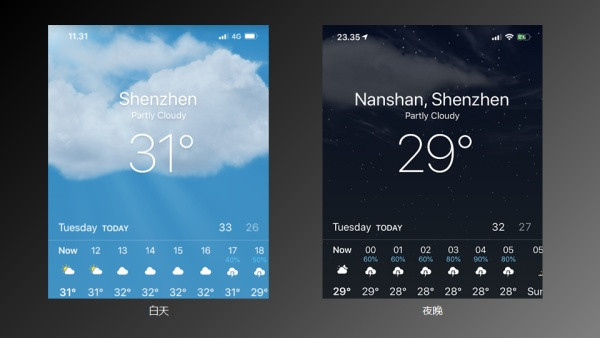 这是苹果的天气设计,很多天气类软件都有类似的设计:展现的情景跟当前的天气状况是实时对应的,白天云朵会飘,晚上甚至能看见星星。