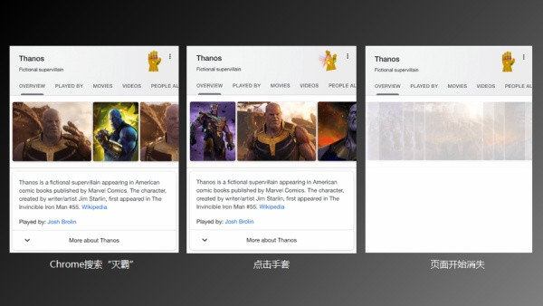 Chrome浏览器搜索“灭霸”,点击右上角的“超能手套”,网页开始消失。真的有一种灭霸打个响指的感觉。如果声音外放,还能听见音效。