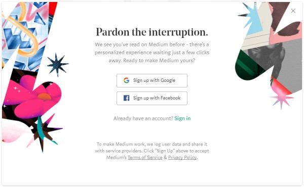 Medium提醒我登录的文案与众不同:先是给我道歉:“抱歉打断你了”,非常有礼貌,不过确实是打断我了,因为我当时正打开一篇新的文章。