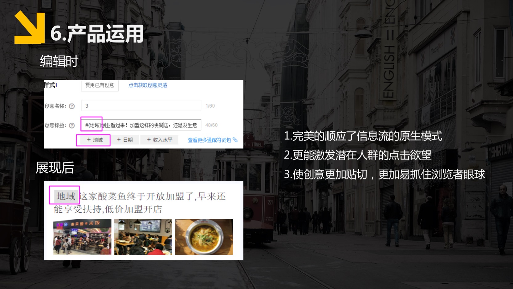 地域通配符,更易抓住浏览者眼球;移动营销页,适合招商加盟广告主,省去高成本制作落地页,高成本追踪转化的繁琐流程。