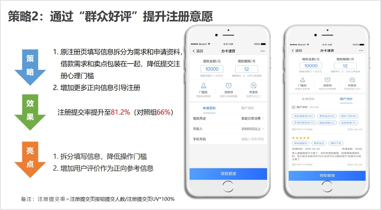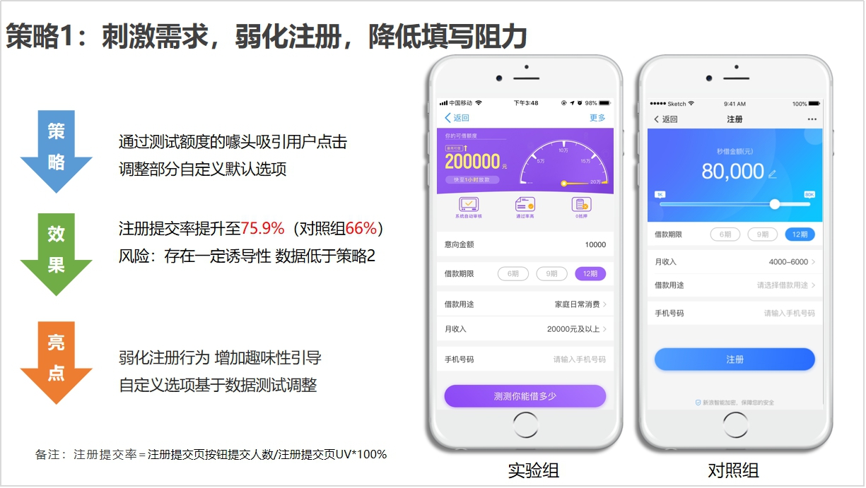 这个方案最终注册提交率指标提升了15%,而且后端用户的贷款申请转化也明显优于之前策略1和对照组。
