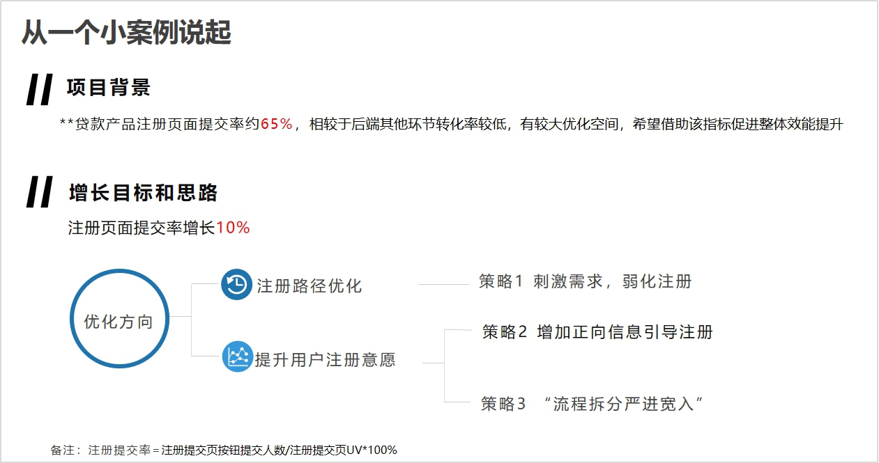 先来看案例,案例的目标是帮助公司旗下一款信用贷产品,提升注册页面的提交率,希望能够在原有基础上获得10%左右的一个指标提升。