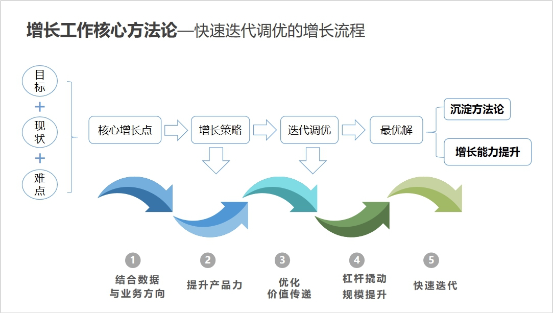 明确了增长团队组建的前提和理念,我们再聚焦到增长工作核心方法论,可以参考以下路径方式来快速迭代我们的增长工作: