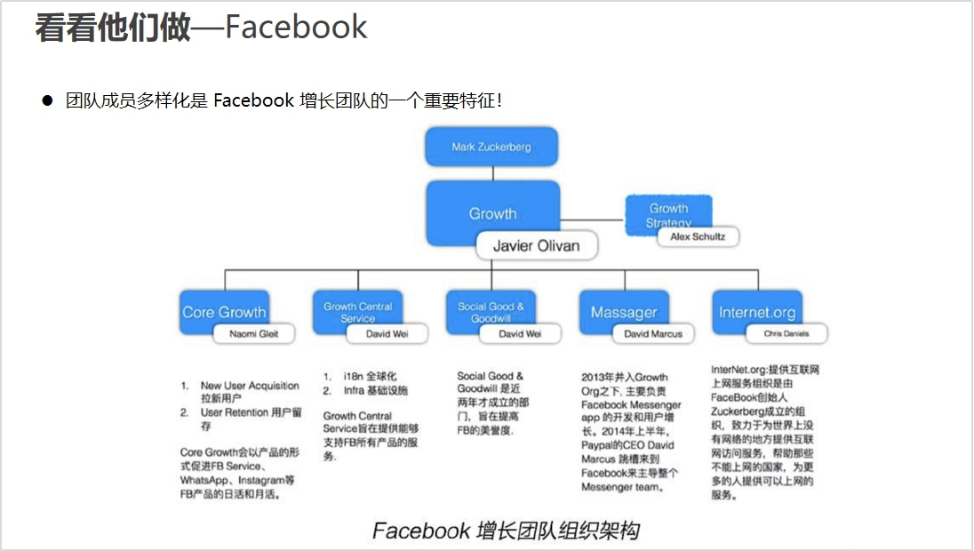 接下来再看看Facebook的增长团队,Facebook的特点在于团队成员的多样性。