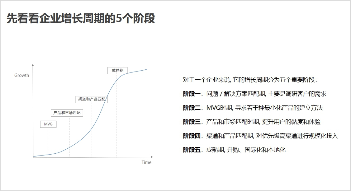 首先是企业的不同增长阶段的影响,之前Growing Io张总归纳企业增长周期可以分成五个阶段。围绕企业不同的阶段,我们在搭建团队的时候也需要不同的策略。